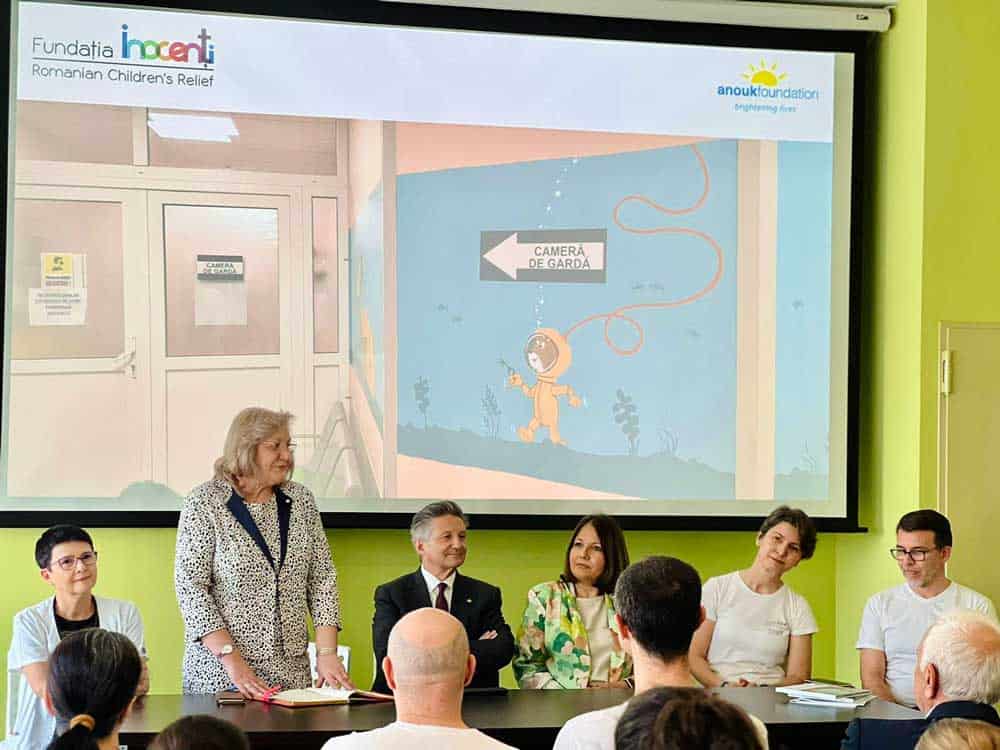 Valentina Maghirescu, director Fundația Inocenți București: „Fundația Inocenți rămâne în spital, camera de joc rămâne cu ușile deschise. Colegii de la Inocenți, psihologi specializați, sunt alături de copii, alături de părinți, dar și de dumneavoastră. Vrem să continuăm povestea de pe pereți, în camera de joc, în inima copiilor.